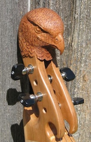 - A carving by Greg Smoot can be added to the peghead. Shown here are three dulcimers: traditional scroll, the head of a Red Fox, and the head of a Harris Hawk.